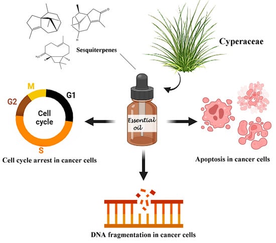 The mechanisms of action of EOs from Cyperaceae species possibly involve DNA fragmentation, cell cycle arrest, and induction of apoptosis (Figure 9). Kilani et al. [] reported that a 50 μg/mL concentration of EO from C. rotundus tubers caused DNA fragmentation and apoptosis in L1210 cells (leukemia). Memariani et al. [] observed that EO from the whole plant of C. longus significantly inhibited the proliferation of MCF-7 cells, with an IC50 of 12.55 μg/mL after 48 h of exposure. Furthermore, at a concentration of 75 µg/mL, EO from C. longus induced apoptosis in MCF-7 (78.23%) and PC-3 (65.35%) cells. Nogueira et al. [] reported that concentrations of 12.5, 25, and 50 μg/mL of EO from C. articulatus rhizomes induced DNA fragmentation in HepG2 cells by up to 22.0, 26.0, and 36.4%, respectively. This same cell line showed cell cycle arrest in the G2/M phase after treatment with EO.