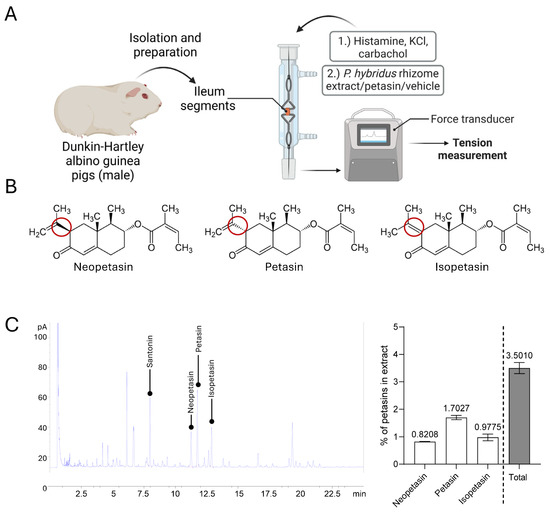 Experimental setup and extract analysis. (A) Schematic overview of the experimental setup. The figure was created with BioRender.com. (B) Structural formulae of the sesquiterpene esters neopetasin, petasin, and isopetasin. Circles indicate structural differences. (C) Representative spectra of gas chromatography analysis and quantitative analysis of neopetasin, petasin, isopetasin, and total petasins of P. hybridus rhizome extract. Santonin served as an internal standard. Bars show mean ± SD (n = 3 analyses). Numbers indicate mean values.