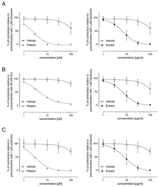 Contraction experiments in the guinea pig ileum have been performed since the 1950s [21], and the protocol has been adapted to the specific requirements of this study as follows. Isolated ileum segments were equilibrated in a test bath containing 20 mL Kreb’s solution for 60 min at an optimum resting tension of 1 g. The preparations were precontracted with 1 µM histamine (Sigma-Aldrich), 1 µM carbachol (Sigma-Aldrich), or 40 mM KCl (Sigma-Aldrich) until a stable tonic contraction was reached. Five cumulative concentrations (indicated in the figure legends) of petasin (Max Zeller Söhne AG, Romanshorn, Switzerland), P. hybridus rhizome extract from wild harvesting or cultivation (Max Zeller Söhne AG), or vehicle control (DMSO) were added into the bath until a relaxation steady state was reached. The tensions developed by the ileum preparations were measured using an isometric force transducer and the signals were analyzed using specialized software (IOX version 1.554, EMKA Technologies, Paris, France) to calculate the dose–response curves and the corresponding IC50 values.