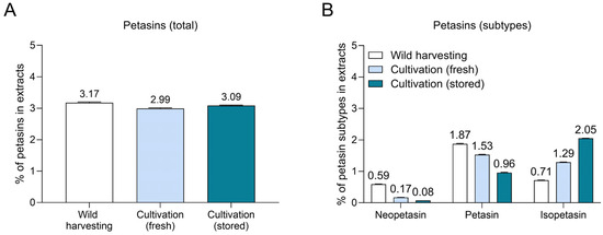 Petasin composition varies in P. hybridus rhizome extracts derived from wild harvesting and cultivation. (A,B) Quantitative analysis from gas chromatography analysis of (A) total petasins and (B) petasin subtypes (neopetasin, petasin, isopetasin) in different P. hybridus rhizome extracts from wild harvesting and cultivation (fresh and stored). Bars show means ± SD (n = 3 analyses). Numbers indicate mean values.