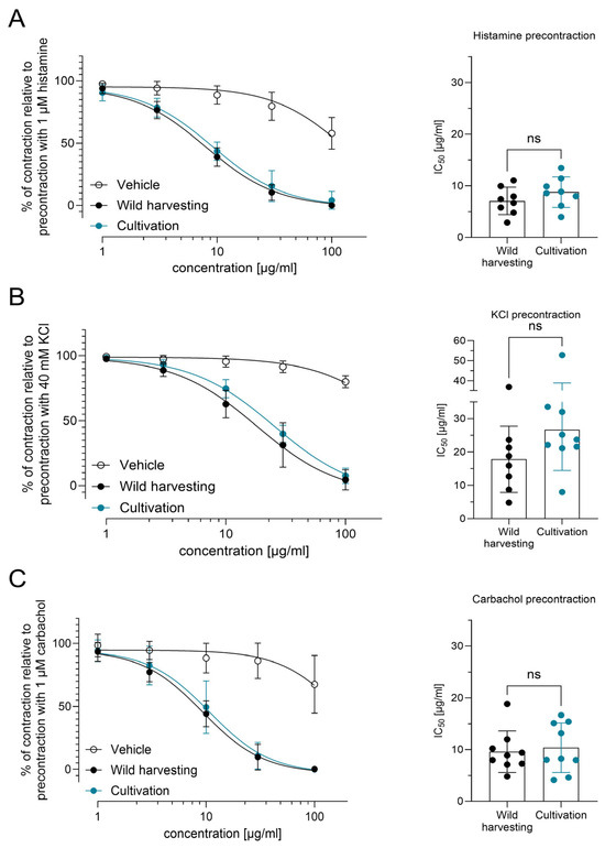 Finally, to investigate the functional impact of the differing petasin compositions in extracts from wild harvesting and cultivation, their antispasmodic effects on precontracted guinea pig ileum ex vivo was compared as described before (Figure 1A). To encompass the greatest possible range and in accordance with the 3R principle (reduce, refine, replace) for animal studies, only the two extracts that exhibited the most notable differences in petasin composition were compared: wild harvesting versus cultivation (stored). No statistically significant differences between the two extracts were found with regard to the dose-dependent relaxation of the precontracted ileum, irrespective of whether the precontraction was induced by histamine, KCl, or carbachol (Figure 4A–C). Furthermore, calculated IC50 [µg/mL] values did not differ significantly (Figure 4A–C). This indicates that extracts derived from cultivated plants exhibit a comparable relaxing effect on ileum contraction as extracts from wild harvesting.