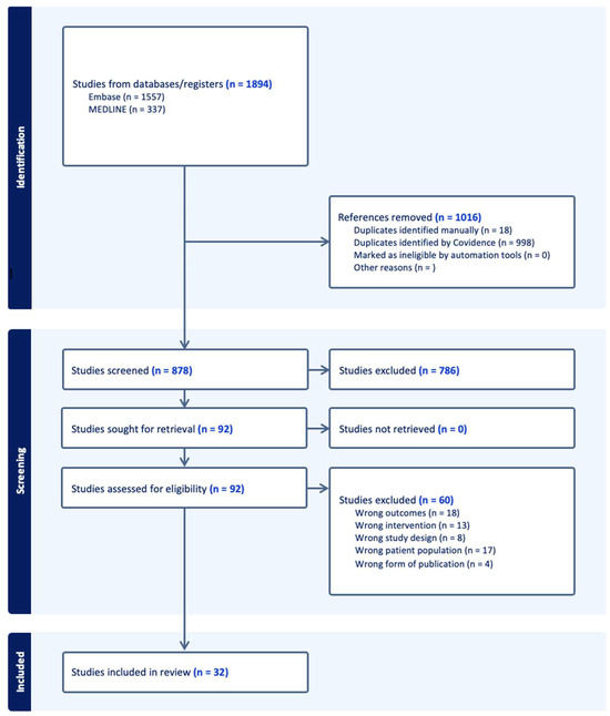 A study flow diagram is shown in Figure 1. The initial database search identified 1894 articles. Through a de-duplication process, 1016 records were removed. Titles and abstracts of the remaining articles were screened, and 786 were determined to be not relevant to the research question. The full-text review of the remaining 92 articles led to the exclusion of 60 additional studies due to factors such as insufficient endpoints. In total, 32 articles met the inclusion criteria and underwent data extraction and analysis.