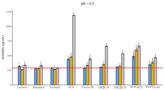 Effect of excipients on the solubility of CAR at three mass ratios in pH = 6.5 BRB solution (columns: blue: 1:0.5, orange 1:1, grey 1:3 API: excipient mass ratio; error bars depict 95% confidence intervals for each bar as opposed to sample; p-values are as follows *** <0.001, ** 0.01–0.001, * 0.01–0.05; red line: solubility of CAR without excipients; red dashed line: 95% confidence intervals of the reference). In the case of fillers, mixed effects were observed, for which concentration dependence was not so obvious. Lactose and mannitol resulted in solubility enchantment, while sorbitol did not have a notable impact. The solubilizing effect of SLS was more pronounced under all circumstances compared to that of Tween 80, resulting in a four-fold increase at a 1:3 mass ratio. For CDs, a linear enhancing effect was observed as a function of concentration, although HPβCD complexation was more pronounced (~2-fold) than SBEβCD complexation (~1.5-fold). In the case of polymers, PVP-K25 caused a more significant effect than PVPVA 64.