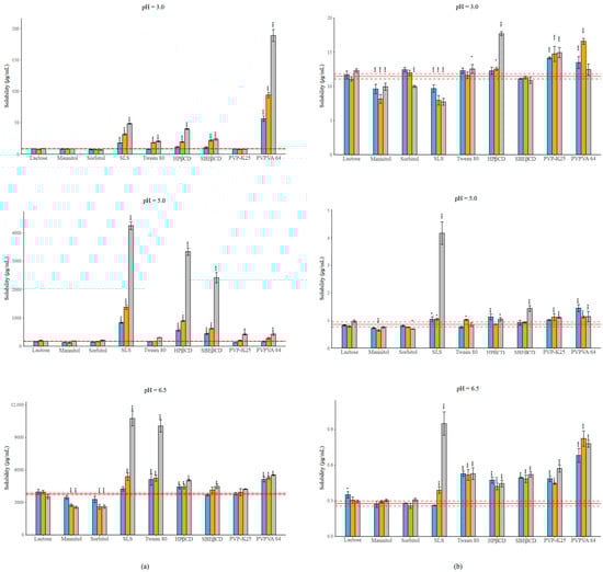 (a) Effect of excipients on the solubility of NAP at three mass ratios in BRB solutions (columns: blue: 1:0.5, orange 1:1, grey 1:3 API: excipient mass ratio; error bars depict 95% confidence intervals for each bar as opposed to the sample. p-values are as follows *** <0.001, ** 0.01–0.001; red line: solubility of NAP without excipients; red dashed line: 95% confidence intervals of the reference) at pH = 3.0; at pH = 5.0; at pH = 6.5. (b) Effect of excipients on the solubility of PIMO at three mass ratios in BRB solutions (columns: blue: 1:0.5, orange 1:1, grey 1:3 API: excipient mass ratio; error bars depict 95% confidence intervals for each bar as opposed to the sample. p values are as follows *** <0.001, * 0.01–0.05; red line: solubility of PIMO without excipients; red dashed line: 95% confidence intervals of the reference) at pH = 3.0; at pH = 5.0; at pH = 6.5. Error bars depict 95% confidence intervals for each bar as opposed to the sample. p values are as follows *** <0.001, ** 0.01–0.001, * 0.01–0.05.