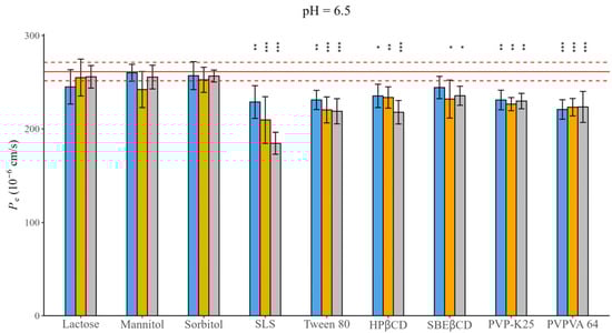 The permeability of CAR was depicted as a single value, 261.38 ± 16.20 10−6 cm/s, measured at pH = 6.5. The excipients moderately affected the permeability, as illustrated in Figure 3; Table S9 contains the exact values. No significant change was observed during the application of fillers, whereas a decrease in permeability was noted with other excipients. SLS caused the most pronounced effect, especially if applied in a high concentration.
