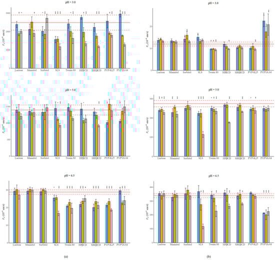 For NAP and PIMO, their Pe is pH-dependent, as is their solubility [26]. NAP exhibited the highest permeability at pH = 3.0: 997.62 ± 46.95 10−6 cm/s, where nearly 99% of the molecule was in its unionized form. As the pH increased, the proportion of the neutral form decreased, leading to decreased permeability as well, with 496.82 ± 32.41 10−6 cm/s at pH = 5.0 and 28.92 ± 1.61 10−6 cm/s at pH = 6.5, where 99% of the molecule was ionized. PIMO, as a basic compound, achieved its maximum permeability at pH = 6.5: 339.67 ± 20.26 10−6 cm/s, followed by 274.82 ± 16.13 10−6 cm/s at pH = 5.0, and the lowest at pH = 3.0: 12.00 ± 1.42 10−6 cm/s. Figure 4 demonstrates the impact of excipients on the permeability of these compounds. Tables S10–S15 contain the exact values.