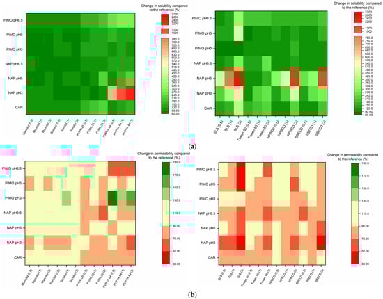 (a) Change in solubility compared to the reference, expressed as a percentage. (b) Change in permeability compared to the reference, expressed as a percentage.