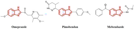 Organic compounds with N-heterocyclic ring systems have demonstrated a wide range of applications, including pharmacological applications [,,], as supported by various studies that have explored their antimicrobial [,,,], anticancer [], antioxidative [], and antiparasitic activity []. These compounds have become target molecules that could play an important role in the fight against problems associated with the most common diseases, including those related to bacterial resistance. Within this group of compounds are benzimidazoles, which were first synthesized in 1872 by Hoebrecker, 1875 by Ladenberg, and 1878 by Wund []. However, it was not until 1944 that Wolley speculated that benzimidazoles could act like purines, given their remarkable similarity, and therefore cause some biological responses []. Today there are several drugs whose structures are based on benzimidazoles (Figure 1), such as omeprazole (proton pump inhibitor), pimobendan (vasodilator), and mebendazole (anthelmintic).