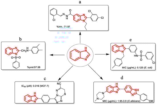 Benzimidazole derivatives with activity (a) anti-inflammatory, (b) analgesic, (c) antiproliferative, (d) antifungal, (e) antibacterial. Note: %inh = Paw edema inhibition; %prot = percentage of protection; IC50 = 50% inhibitory concentration; MIC = minimum inhibitory concentration.
