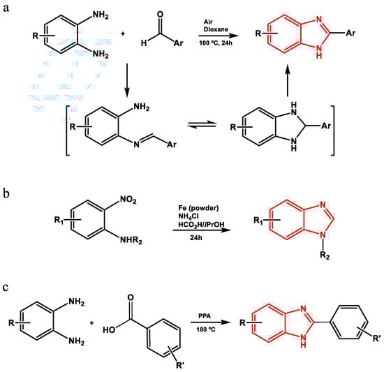 Benzimidazole derivatives can be obtained by different methods (Figure 3), including the condensation of phenylenediamines and aldehydes to produce Schiff bases that are subsequently subjected to oxidative cyclodehydrogenation []; the use of aromatic or heteroaromatic 2-nitroamines and formic acid in the presence of Fe and NH4Cl []; the use of N-methyl-1,2-phenylenediamines, carbonitriles and sodium hydride []; or the high-temperature condensation of phenylenediamines and aromatic carboxylic acids under strongly acidic conditions (polyphosphoric acid (PPA), 180 °C) to obtain 2-(phenylsubstituted) benzimidazoles [,,].