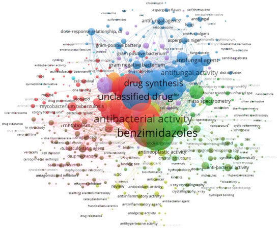This review describes the characterization and evaluation of the antibacterial activity of metal complexes of Ni(II) and Cu(II) with ligands derived from 2-(phenylsubstituted) benzimidazole, highlighting their importance as possible antibacterial agents that could contribute to the fight against antibiotic resistance. It is important to note that, in the antibacterial activity studies addressed in this review, the complexes are dissolved directly in culture medium or using dimethyl sulfoxide (DMSO) as a vehicle to subsequently improve solubility in the culture medium for the microdilution method. For the disk diffusion method, the complexes are usually dissolved in DMSO, and pure DMSO is used as the control solvent. In this study, the Scopus database was chosen for the bibliographic search, it has bibliometric tools to track, analyze, and visualize research []. The search equation used was TITLE-ABS-KEY (antibacterial AND benzimidazoles AND derivatives) AND PUBYEAR > 2008 AND PUBYEAR < 2026 AND (LIMIT-TO (DOCTYPE, “ar”) OR LIMIT-TO (DOCTYPE, “re”) OR LIMIT-TO (DOCTYPE, “ch”) OR LIMIT-TO (DOCTYPE, “cp”) OR LIMIT-TO (DOCTYPE, “cr”)) AND (LIMIT-TO (LANGUAGE, “English”)) which applies basic filters to ensure that the final sample analyzed presents documents that exclusively address topics around the antibacterial activity of benzimidazole derivatives published between the period from 2009 to 2025. Documents that did not meet these criteria were excluded. The VOSviewer software (www.vosviewer.com, (accessed on 10 December 2024)); version 1.6.18, Leiden University, Leiden, The Netherlands) was applied to visualize the preliminary results and create a bibliographic map (Figure 4). Each node symbolizes a specific keyword, and its size indicates the importance of the keyword within the existing literature. The connections between the nodes illustrate the co-occurrence relationships that exist between the keywords. Additionally, keywords are distinguished by color coding to reflect their respective clusters, so keywords from the same cluster show a greater propensity to appear simultaneously in the literature.