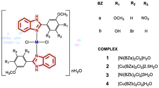 In the literature, interesting results have been found regarding the antibacterial activity of copper and nickel metal complexes with 2-(phenylsubstituted) benzimidazole ligands [,,,], with scarce reports of complexes with monodentate 2-(phenylsubstituted) benzimidazole derivatives. Complexes 1–4 (Figure 5) were synthesized from salts of Cu(II) and Ni(II) to which the ligands BZa and BZb were added under constant agitation. Once the reaction was complete, the mixtures were refluxed for 48 h at 50 °C. Characterization of the metal complexes indicated that monodentate ligand binding to the metal occurred through a coordinated bond with the nitrogen atom (azomethine) [].