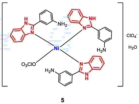 Complex 5 (Figure 6) was synthesized by mixing methanolic solutions of Ni(ClO4)2 and m-aminophenylbenzimidazole (m-APB) and refluxing for a period of 4–6 h []. The formation of 5 was confirmed by FT-IR spectroscopy. Vibrations were observed corresponding to C=N bonds within the range from 1600 to 1632 cm−1 (displaced with respect to the free ligand), NH(amino) at 3300 cm−1, NH(benzimidazole) at 3050 cm−1 and ClO4− between 1100 and 620 cm−1 for the coordinated ligand. The electrolytic behavior was verified by molar conductivity measurements (76 S∙cm2∙mol−1). Additionally, 1H-NMR signals attributable to amino protons (NH2) and benzimidazole (NH) were observed as singlets at 5.78 and 16.0 ppm, respectively, while the aromatic protons showed multiplets between 6.98 and 7.66 ppm. The planar square geometry was corroborated by UV-vis spectroscopy, where bands at 368 and 570 nm were observed for the 1A1g → 1B1g and 1A1g → 1A2g transitions, respectively) [,].