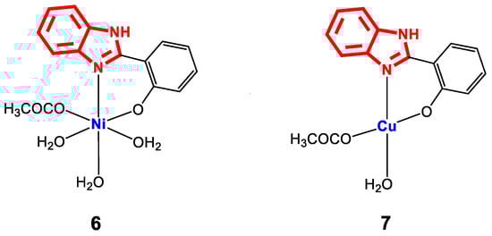The stability of metal complexes improves with the presence of ligands that contain different coordination points (multidentate ligands), a property that several 2-(phenylsubstituted) benzimidazole derivatives possess. For example, 2-(hydroxyphenyl)benzimidazole ligands contain a hydroxy group in the phenyl, which can be deprotonated to form a strong O-M covalent bond. For the complexes [NiL(H2O)3(AcO)]H2O (6) and [CuL(H2O)(AcO)] (7) (Figure 7), which were synthesized from a ligand L and M(AcO)2nH2O, both their structure and the geometry were optimized using Hyperchem 8.03 software to obtain the bond lengths around the central ion (Table 2). For the determination and confirmation of the structure of complexes 6 and 7, FT-IR was used, which revealed main bands of C=N at 1572 and 1586 cm−1, CO at 1280–1301 cm−1, M-O between 569 and 633 cm−1, M-N between 459 and 514 cm−1 and the water molecules in the network at 3479 and 3455 cm−1, as well as bands for acetate groups between 1352 and 1558 cm−1. In addition, EI-MS analysis revealed molecular weights of 399.01 and 349.83 g∙mol−1, corresponding to the formulas C15H20N2NiO7 and C15H14CuN2O4, respectively, and a metal/ligand coordination ratio of 1:1.