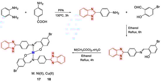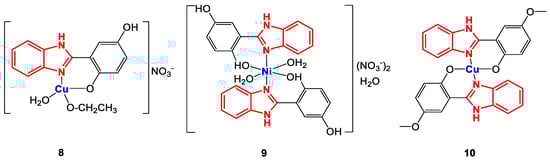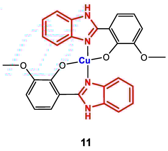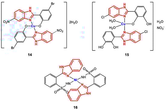 From methanolic solutions of the ligands 2-(5-nitro-1H-benzimidazol-2-yl)-4-bromophenol, 3-(5-chloro-1H-benzimidazol-2-yl)-benzene-1,2-diol and 2-(o-sulfamoylphenyl)benzimidazole, copper and nickel complexes 14–16 were synthesized [,] (Figure 11).