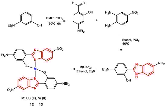Padalkar et al. synthesized complexes 12 and 13 from the ligand 5-(diethylamino)-2-(5-nitro-1H-benzimidazol-2-yl)phenol and copper and nickel salts (Figure 10) for subsequent determination of their antibacterial activity against the strains S. aureus (+) and E. coli (-) [].