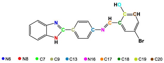 Distribution and enumeration of atoms in the ligand 2-((4-(1H-benzimidazol-2-yl)phenylimino)methyl)-4-bromophenol.