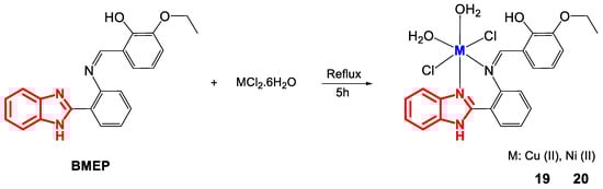 Cu(II) and Ni(II) complexes have also been synthesized with other Schiff bases, such as BMEP derived from 2-(2-(aminophenyl)benzimidazole) (Figure 14) [].