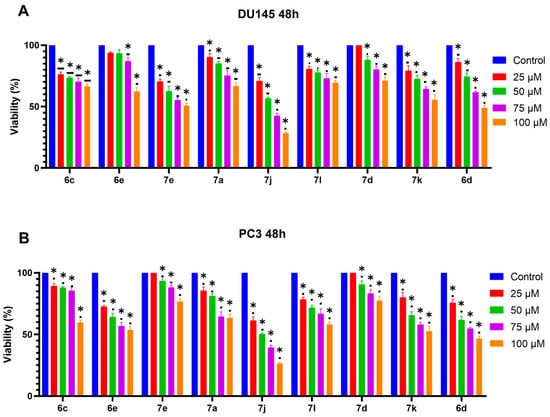 DU145 and PC3 cell lines were selected for this study based on previous reports that validate them as a CRPC model [43,44,45]. The viability of these cell lines treated with different concentrations (25, 50, 75 and 100 µM) of the nine prenylated chalcones incubated at 0, 24 and 48 h was analyzed by MTT assay (Figure 2). At time zero, both cellular lines showed 100% viability; however, after 48 h, the DU145 cell line viability decreased to 48.94% with the 6d and 28.29% with the 7j at the same chalcone concentration (Figure 2A). The PC3 cells reduced their viability to 46.6% with 6d and 26.56% with 7j at a 100 µM chalcone concentration (Figure 2B). These two chalcones were used for subsequent assays at a 100 µM concentration and 48 h incubation.