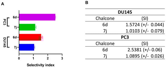 Selectivity index (SI) of chalcones 6d and 7j on CRPC cell lines. (A) Bar graph representing the selectivity index (SI) values of chalcones 6d and 7j for DU145 and PC3 cells after 48 h of treatment. The SI was calculated as the ratio of IC50 in RWPE-1 (non-cancerous prostate epithelial cells) to IC50 in cancer cell lines. (B) Numeric representation of the SI values shown in panel (A). An SI ≥ 1 indicates preferential cytotoxicity against PCa cells over non-cancerous cells. Values represent the mean ± SD of three independent experiments.
