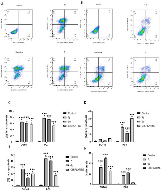 Apoptotic effect of chalcones 6d, 7j on CRPC cells. (A) DU145 cell line and (B) PC3 cells treated with 100 µM of 6d, 7j, or 2 µg/mL of cisplatin, analyzed by Annexin V/PI flow cytometry assay after 48 h of treatment. A representative image of three independent experiments is shown and compared with untreated control or cisplatin-treated cells. Graphic representations of a total alive population (C), the population in early apoptosis (E), the population in late apoptosis (F), and the necrotic population (D) are shown. (C) The bar graph shows the standard deviation represented by the error bars. *** p < 0.001, significant differences.
