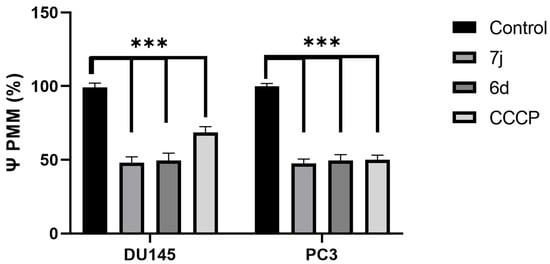 The membrane potential of DU145 and PC3 treated with 7j and 6d. On the Y-axis the membrane potential is shown; on the X-axis, the treatments applied are shown. CCCP: Carbonyl Cyanide 3-Chlorophenylhydrazone. The standard deviation is represented by the error bars of three independent experiments. ΨPMM: Potential Mitochondrial Membrane. *** p < 0.001, statistically significant differences between treatments and control are shown.