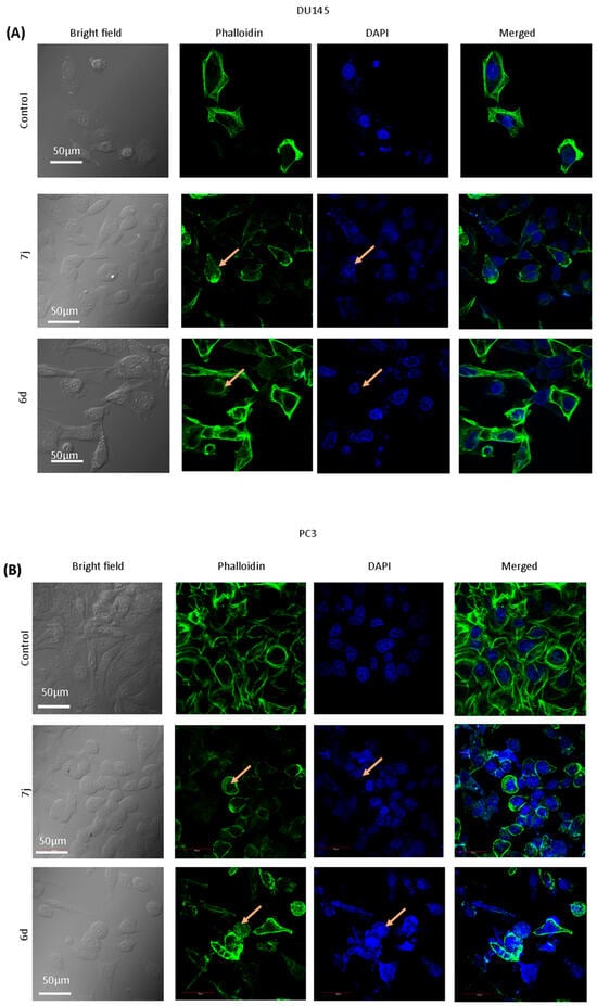 Morphology changes induced by chalcone treatment on PC3 and DU145 cell lines. Confocal microscopic images of the effect of chalcones 7j or 6d on (A) DU145 and (B) PC3 cell lines. Bright-field (first panel), Phalloidin- FITC (second panel), DAPI stained (third panel) and merged channel (fourth panel) are shown. The orange arrow shows the actin filaments.