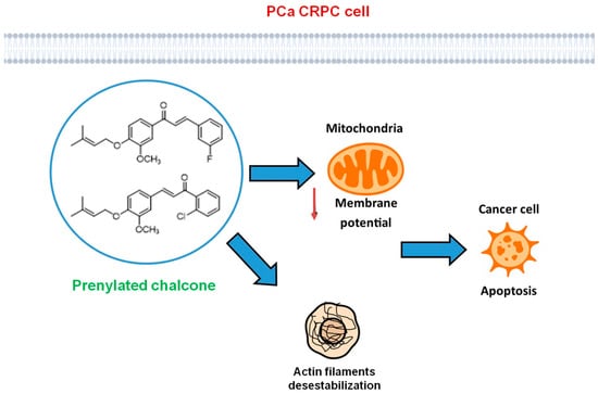 Proposed mechanism of action of prenylated chalcones in castration-resistant prostate cancer (CRPC) cells. Figure illustrates how prenylated chalcones (6d and 7j) exert cytotoxic effects on CRPC cells inducing mitochondrial membrane potential disruption and actin filament destabilization, which can ultimately lead to apoptotic cell death in PCa cells. PCa. Up-red arrow (↓) indicates decrease function. (→) indicates effect on mitochondria, actin filaments and apoptosis.