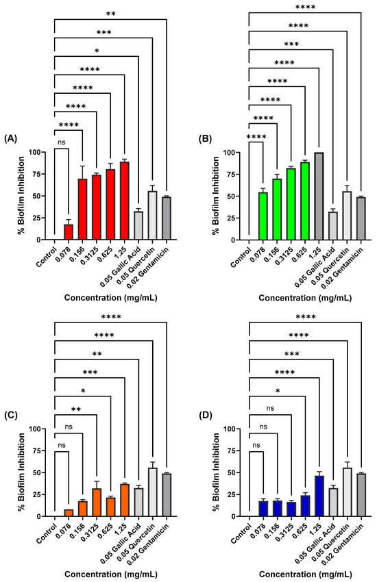 Antibiofilm activity of Cyprus Quercus species ethanolic leaf extracts against Staphylococcus aureus (ATCC 6538). (A) Quercus alnifolia. (B) Quercus × campitica. (C) Quercus coccifera. (D) Quercus infectoria. Results are expressed as mean ± standard error of the mean (n = 6). One-way analysis of variance (ANOVA) with Dunnett’s multiple comparison test. Mean values with one or more asterisks above the column denote statistical significance: * p < 0.05; ** p < 0.01; *** p < 0.001; **** p < 0.0001. ns = not significant.