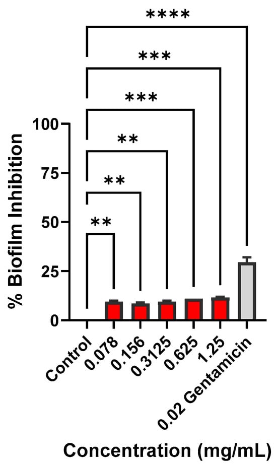 Preformed biofilm reduction by Quercus alnifolia ethanolic leaf extract against Staphylococcus aureus (ATCC 6538). Results are expressed as mean ± standard error of the mean (n = 6). One-way analysis of variance (ANOVA) with Dunnett’s multiple comparison test. Mean values with one or more asterisks above the column denote statistical significance: ** p < 0.01; *** p < 0.001; **** p < 0.0001.
