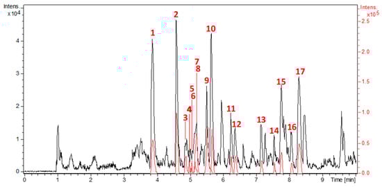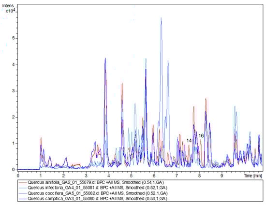 Overlay of +ESI-LCMS-BPC of the four Cyprus Quercus ethanolic leaf extracts. Peaks 14 and 16 are significantly prevailing in Q. alnifolia (red overlay). Q. × campitica, Q. coccifera, and Q. infectoria have blue overlays. ESI = electrospray ionization. LC-MS = Liquid Chromatography–Mass Spectrometry. BPC = base peak chromatograph. Peaks 14 and 16 were found specific for Q. alnifolia and were tentatively assigned to quercetin-(O-acetyl-di-O-coumaroyl hexoside) and quercetin-(O-di-acetyl-di-O-coumaroyl hexoside), respectively.