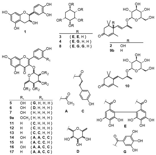 Structures tentatively assigned on the basis of the +ESI-LCMS analysis of Quercus alnifolia ethanolic leaf extract. Bold numbers refer to compounds listed in Table 2. The letters in curly brackets for R and R2 denote either a hydrogen atom (H) or the acyl residues acetyl- (A), p-cumaroyl- (C), desoxyhexosyl- (D), hexahydroxydiphenoyl- (E) or galloyl- (G), whose structures are also shown in the figure.