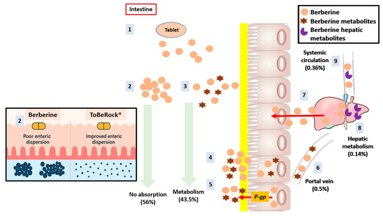 Berberine route after oral supplementation (adapted from Colletti A et al. 2022 [13]). After ingestion, the tablet disintegrates and releases the BBR particles (1). However, about 56% of BBR is not absorbed in the GI tract due to self-aggregation (2). In addition, intestinal metabolism (operated by both gut microbiota and CYP450) is responsible for 43.5% of total BBR-particles (3). Finally, the poor permeability (4), P-gp-mediated efflux (5) and hepatobiliary re-excretion (7) also contribute to the reduction in bioavailability. Only 0.5% of BBR enter the portal circulation (6) and 0.36% arrive in the systemic circulation (9).