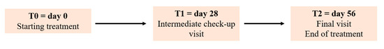 Personal data and physiological/pathological anamnesis were only collected at the enrolment visit (T−0), and treatment compliance data were collected in T1 and T2.