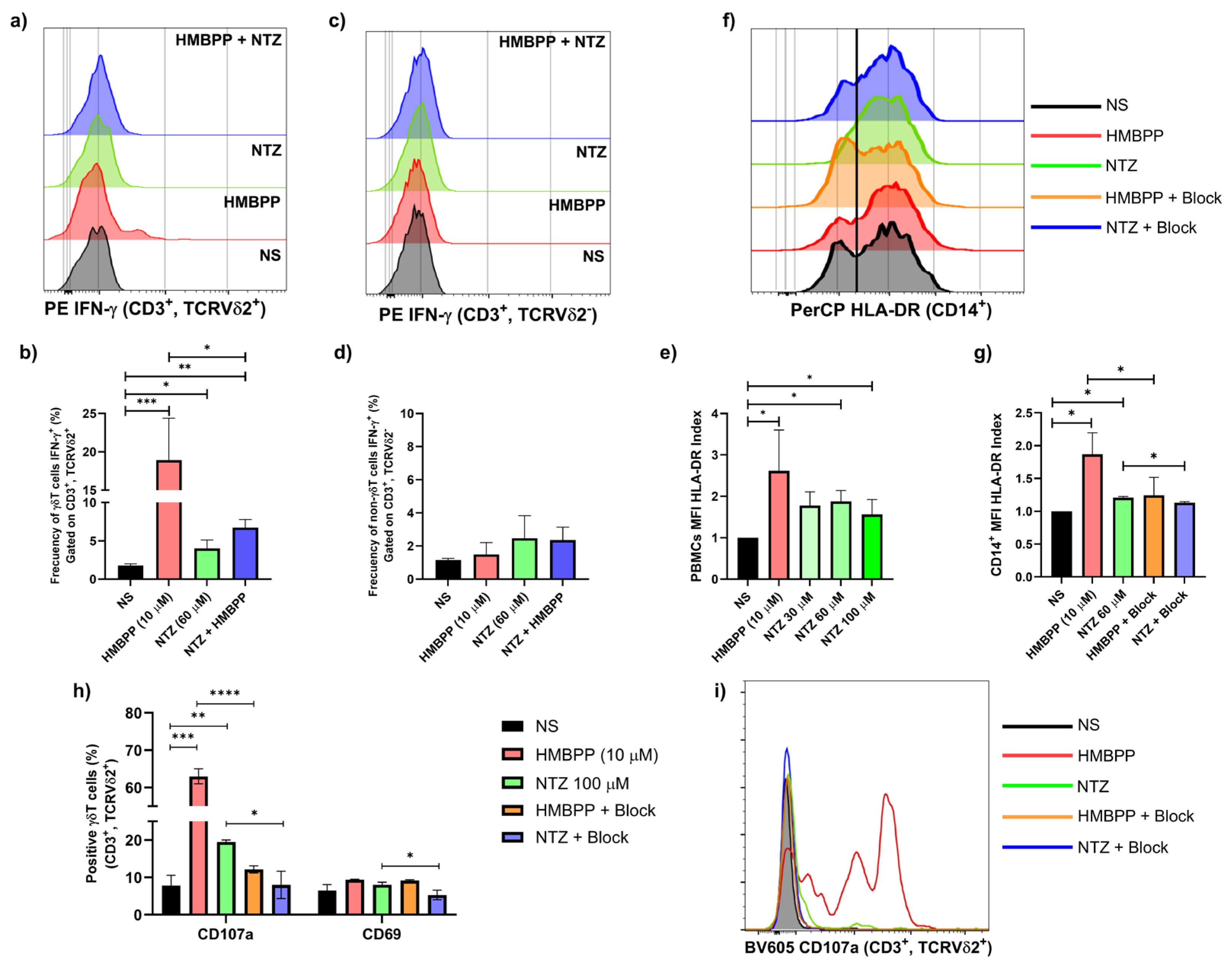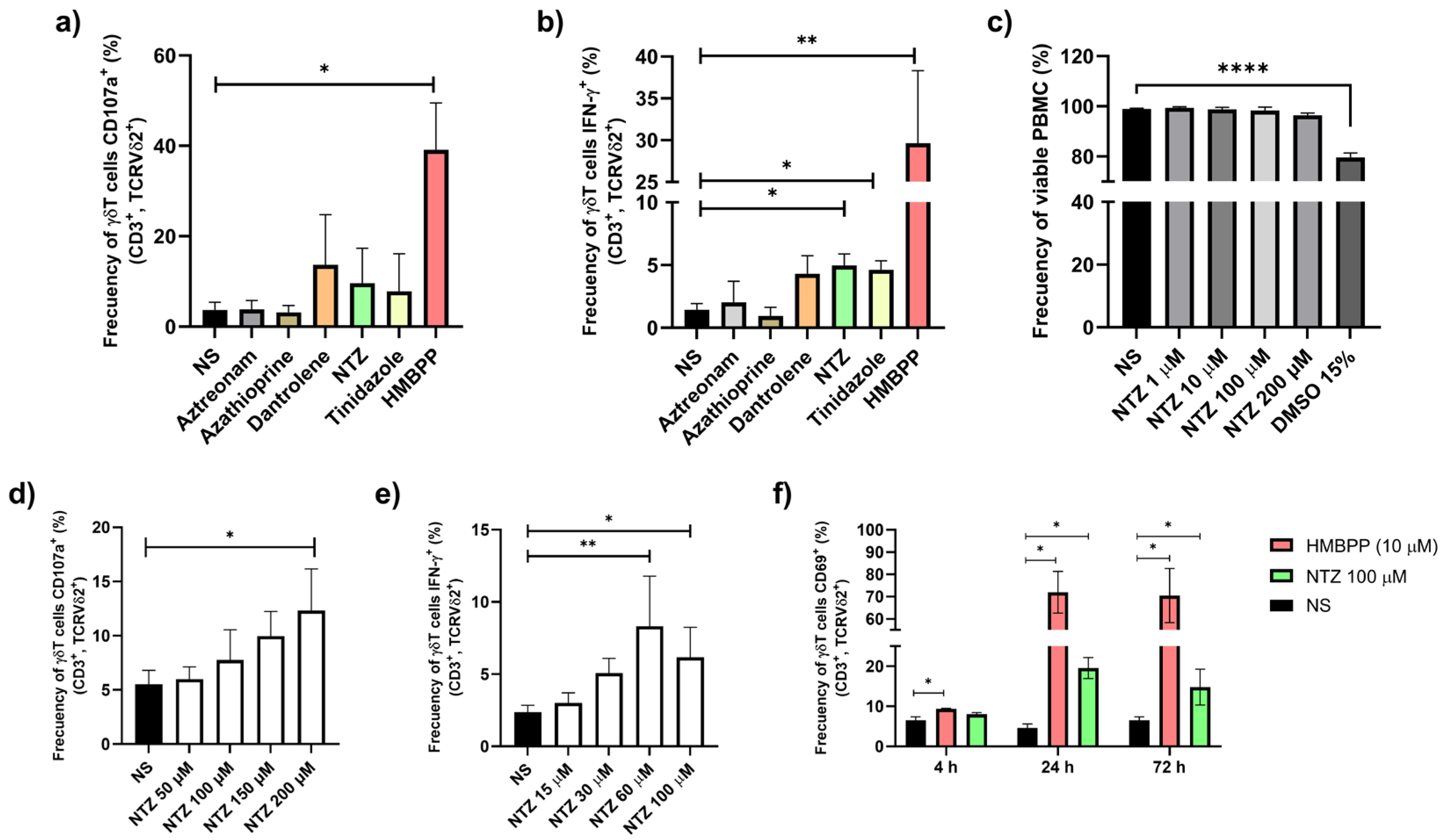 3.4. Co-Incubation of NTZ with HMBPP Dampers the Production of IFN-γ in Vγ9Vδ2 T Cells When Incubated In Vitro