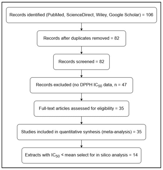 PRISMA-like flow diagram illustrating the identification, screening, eligibility, and inclusion of studies in the quantitative synthesis of D. ambrosioides (DPPH assay, 2005–2025). Extracts with IC50 values below the global mean were prioritised for in silico analysis.