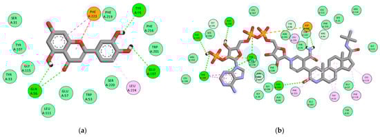 (5AR2): (a) Interactions of luteolin with steroid 5α-reductase type 2 (5AR2, 7BW1). Hydrogen bonds are observed with GLN56, TYR91, and GLU197, together with hydrophobic interactions involving LEU224, and a π-π stacking interaction with PHE223, along with van der Waals contacts with TRP053, GLU057, PHE219, and SER220, among others. (b) The binding affinity (−9.4 kcal/mol) was comparable to that of the control compound finasteride (−13.4 kcal/mol). Colour/interaction code: Dark green dashed lines indicate conventional hydrogen bonds; light green dashed lines represent carbon–hydrogen bonds; pink dashed lines indicate hydrophobic (alkyl/π–alkyl) or π–π stacking interactions; copper-coloured dashed lines correspond to π–anion or attractive charge interactions; and pale green shading indicates van der Waals contacts, which are not specifically represented by lines.