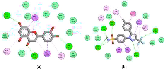 (COX-2): (a) Interactions of luteolin with COX-2 (3LN1). Hydrogen bonds are observed with TYR341, ILE503, and SER516, along with hydrophobic contacts involving VAL335 and ALA502. π–σ interactions are also observed with LEU338 and VAL509, contributing to the stabilisation of the complex. (b) The binding pattern replicates the active site occupied by celecoxib (−11.4 kcal/mol). Colour/interaction code: Dark green dashed lines indicate conventional hydrogen bonds; light green dashed lines represent carbon–hydrogen bonds; pink dashed lines indicate hydrophobic (alkyl/π–alkyl) or π–π stacking interactions; purple dashed lines denote π–σ interactions; and pale green shading indicates van der Waals contacts, which are not specifically represented by lines.