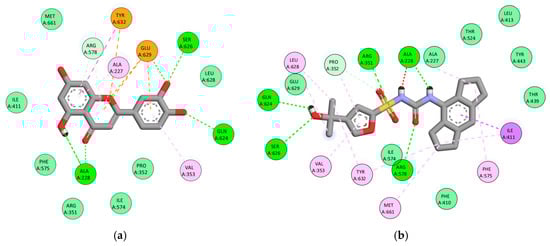 (NLRP3): (a) Interactions of luteolin with NLRP3 (7ALV). Hydrogen bonds are identified with ALA228, GLN624, and SER626, together with π–cation/π–anion interactions involving GLU629 and TYR632, and a π-π stacking interaction with TYR632, (b) analogous to the binding mode of the MCC950 inhibitor (−10.6 kcal/mol). Colour/interaction code: Dark green dashed lines indicate conventional hydrogen bonds; light green dashed lines represent carbon–hydrogen bonds; pink dashed lines indicate hydrophobic (alkyl/π–alkyl) or π–π stacking interactions; purple dashed lines denote π–σ interactions; copper-coloured dashed lines correspond to π–anion or attractive charge interactions; and pale green shading indicates van der Waals contacts, which are not specifically represented by lines.