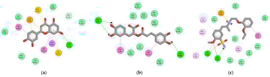 (α1A): Interactions of luteolin and rosmarinic acid with the α1A-adrenergic receptor (7YMJ). (a) Luteolin forms hydrogen bonds with THR111, π–anion interactions with ASP106, π-π stacking interactions with PHE288/PHE289, and π–sulphur interactions with CYS110 and MET292. (b) Rosmarinic acid exhibits hydrogen bonds with GLU87 and ASP106, π-π stacking interactions with PHE086 and PHE312, and van der Waals contacts with residues within the transmembrane domain. (c) Both compounds displayed binding affinities (−7.7 kcal/mol) comparable to that of tamsulosin (−7.3 kcal/mol). Colour/interaction code: Dark green dashed lines indicate conventional hydrogen bonds; light green dashed lines represent carbon–hydrogen bonds; pink dashed lines indicate hydrophobic (alkyl/π–alkyl) or π–π stacking interactions; yellow dashed lines represent π–sulphur interactions; purple dashed lines denote π–σ interactions; copper-coloured dashed lines correspond to π–anion or attractive charge interactions; and pale green shading indicates van der Waals contacts, which are not specifically represented by lines.