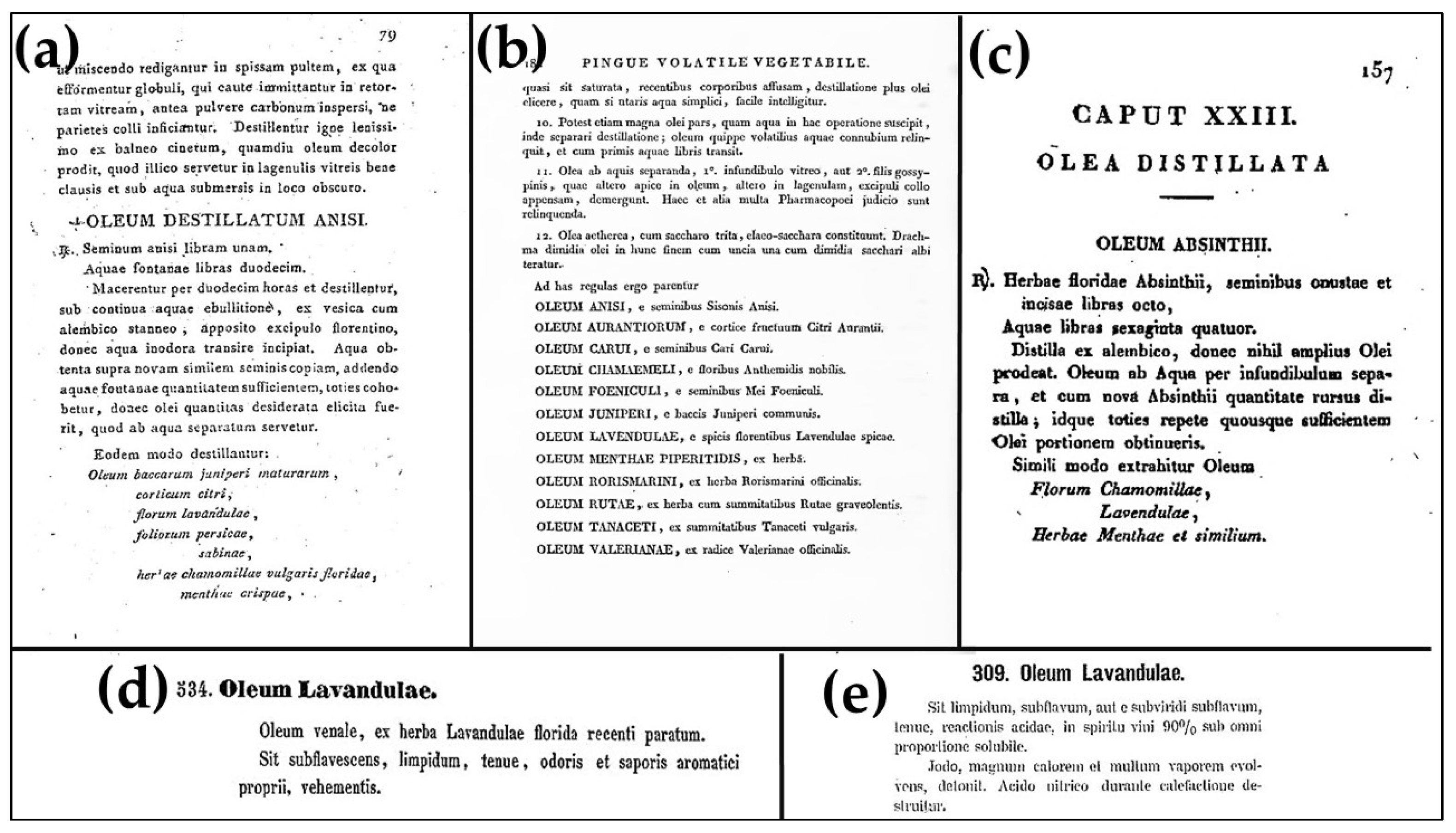 | Plant Source of the Described Oils | Ph. Belgica (1823) | Ph. Hispanica (1826) |