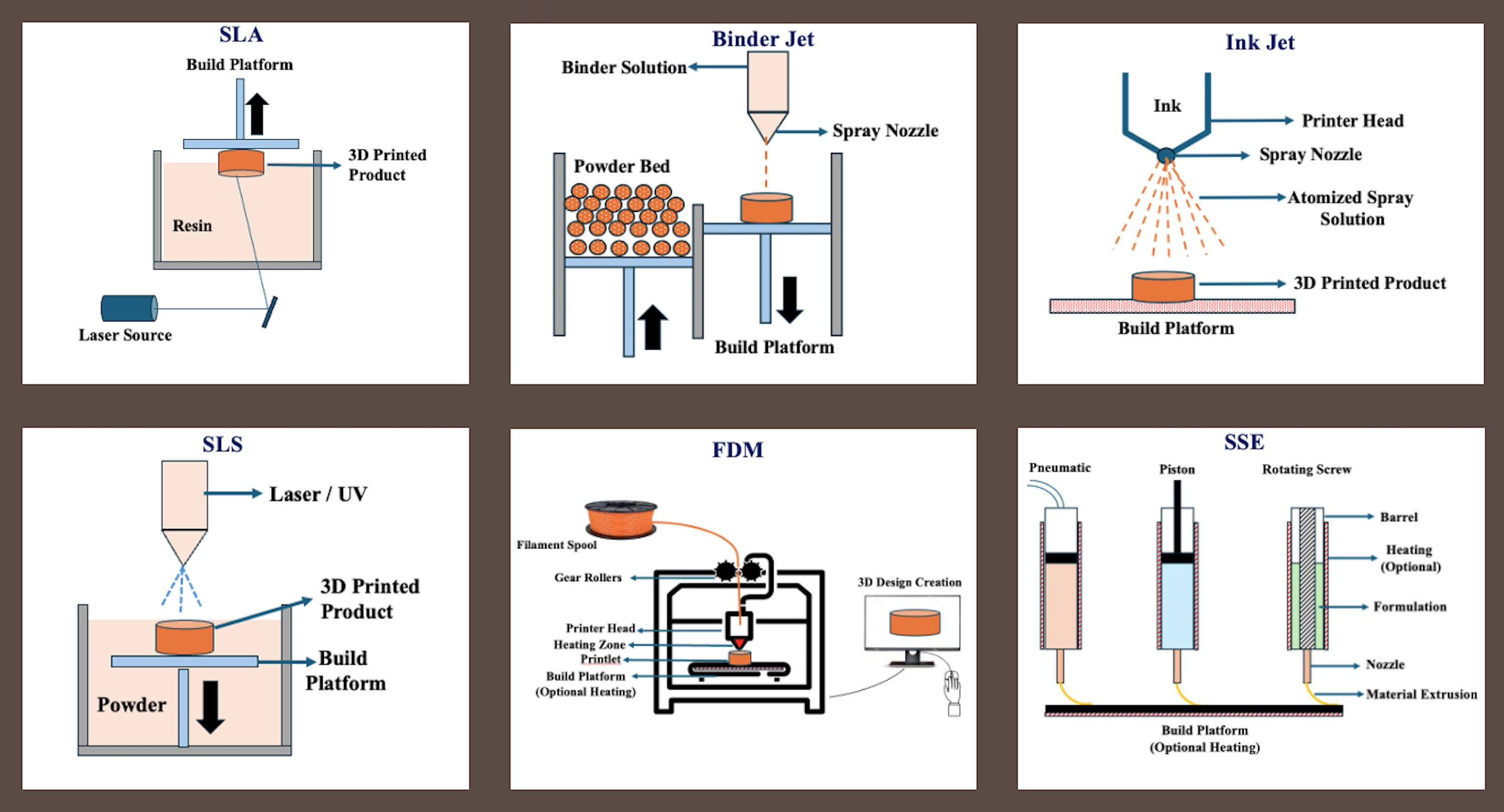 | SLA | The drug solution, consisting of photopolymer resin, is cured in the shape of a 3D design with the application of UV light | Methacrylate, PEG diacrylate resins |