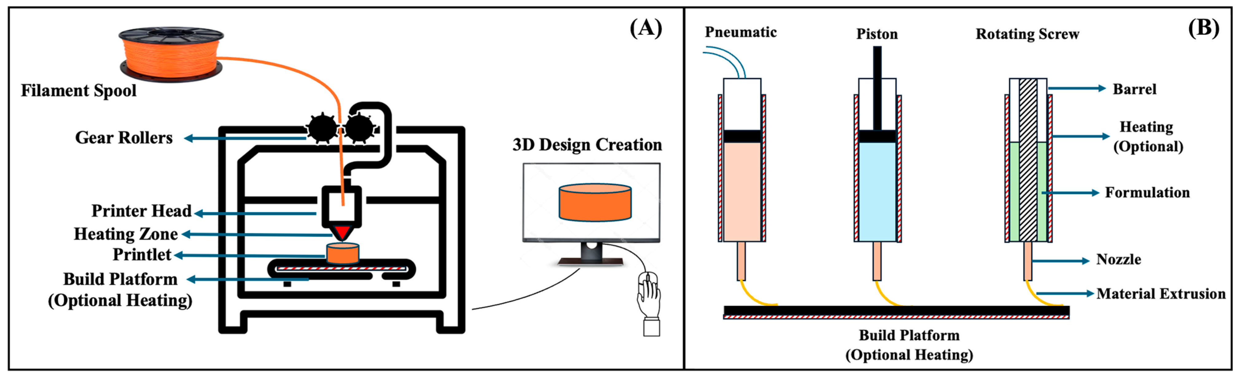 | FDM | Drug-loaded polymeric filament is melted and extruded layer by layer | Polymers such as HPMC, HPC, Eudragit, PEO, PVA, PVP |