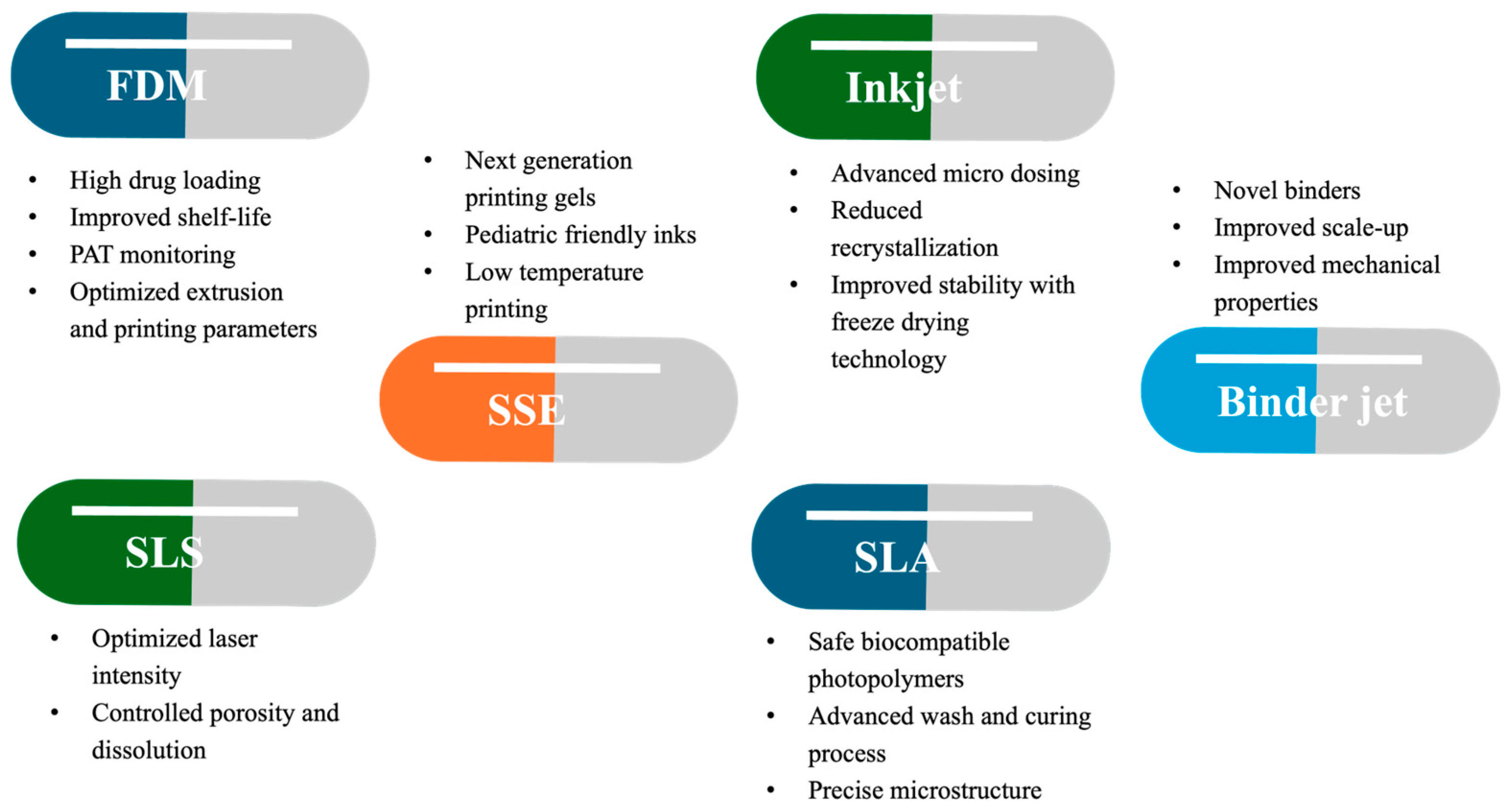 | FDM | PVA, HPC, PEO, PLA, PEG-based polymers, PVP, HPMC | Suitable for solubility enhancement and for developing controlled release formulations |