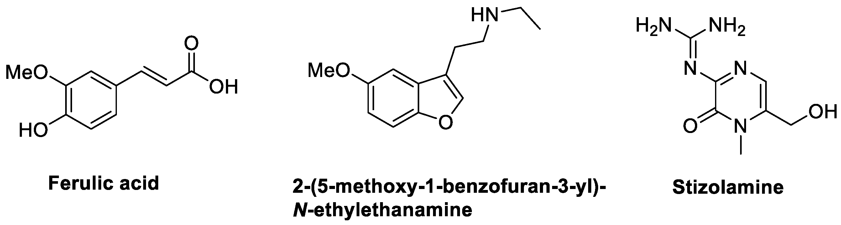 - Parrales-Macias, V.; Harfouche, A.; Ferrié, L.; Haik, S.; Michel, P.P.; Raisman-Vozari, R.; Figadère, B.; Bizat, N.; Maciuk, A. Effect of a new natural catechol-O-methyl transferase inhibitor on two in vivo models of Parkinson’s disease. ACS Chem. Neurosci. 2022, 13, 3303–3313. [Google Scholar] [CrossRef]