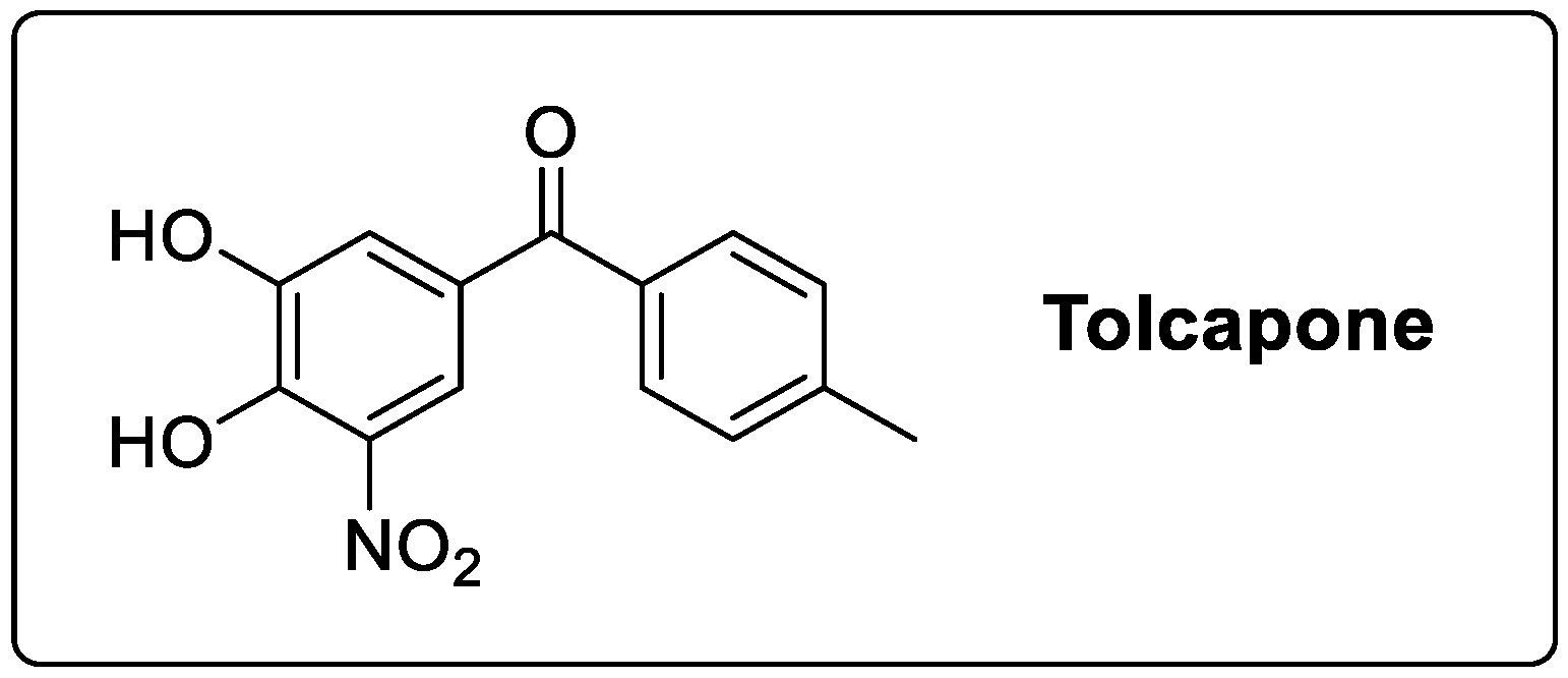- Forsberg, M.; Lehtonen, M.; Heikkinen, M.; Savolainen, J.; Järvinen, T.; Männistö, P.T. Pharmacokinetics and Pharmacodynamics of Entacapone and Tolcapone after Acute and Repeated Administration: A Comparative Study in the Rat. J. Pharmacol. Exp. Ther. 2003, 304, 498–506. [Google Scholar] [CrossRef] [PubMed]