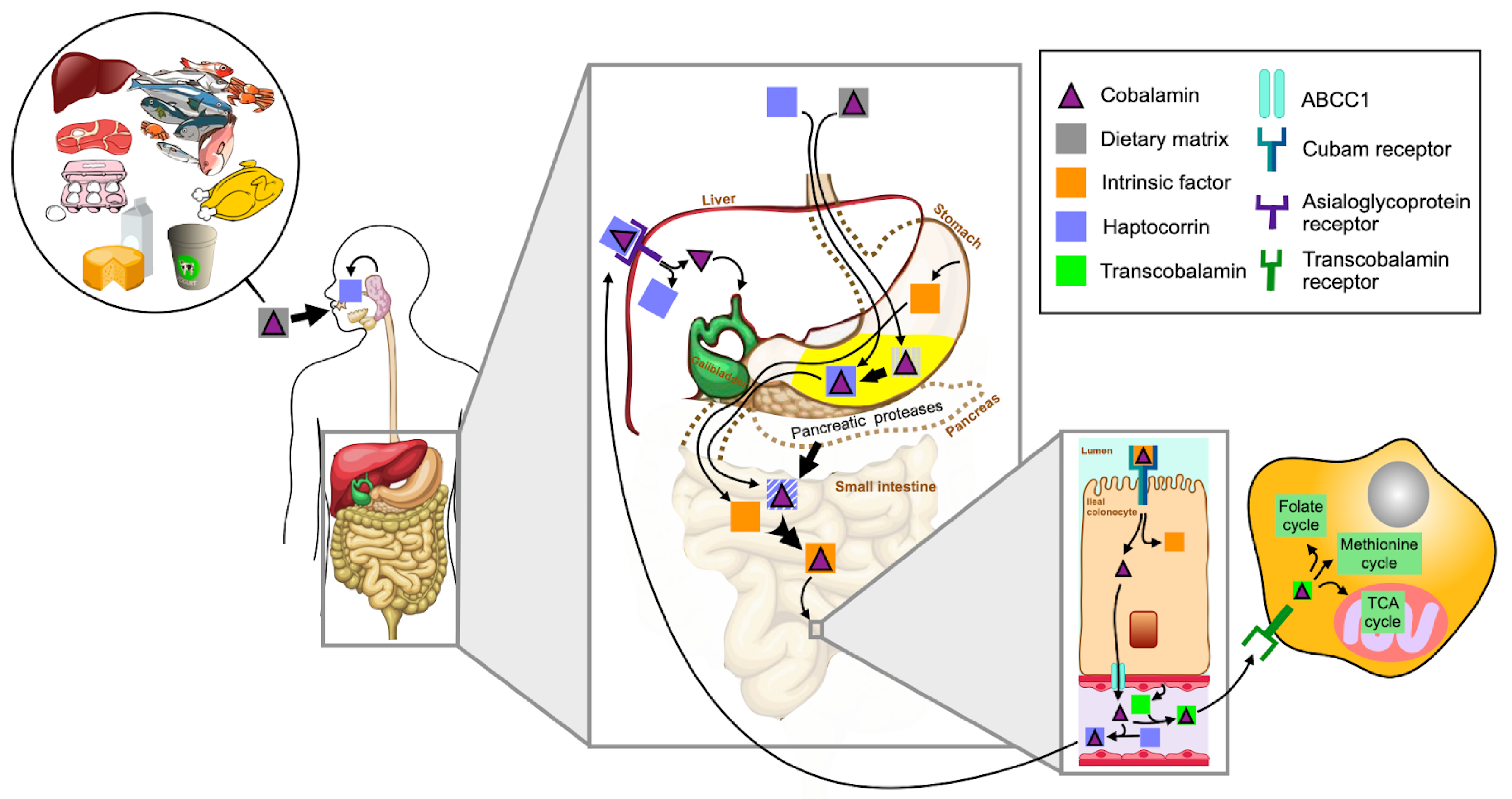Figure 2. Cobalamin human metabolism. Cbl is obtained from different food sources, such as meat and dairy products. The matrix that is bound to Cbl in food sources is replaced in the stomach by haptocorrin secreted in the saliva. Once in the small intestine, pancreatic proteases release Cbl from haptocorrin, and Cbl is then bound to the gastric intrinsic factor. This IF-bound complex is then uptaken by intestinal cells, and free Cbl is released to the bloodstream, where it binds to transcobalamin. Cells from different tissues can uptake Cbl bound to transcobalamin for its intracellular metabolism in folate, methionine, or the TCA cycles. The figure was generated with the help of Microsoft® PowerPoint for Mac version 16.105.