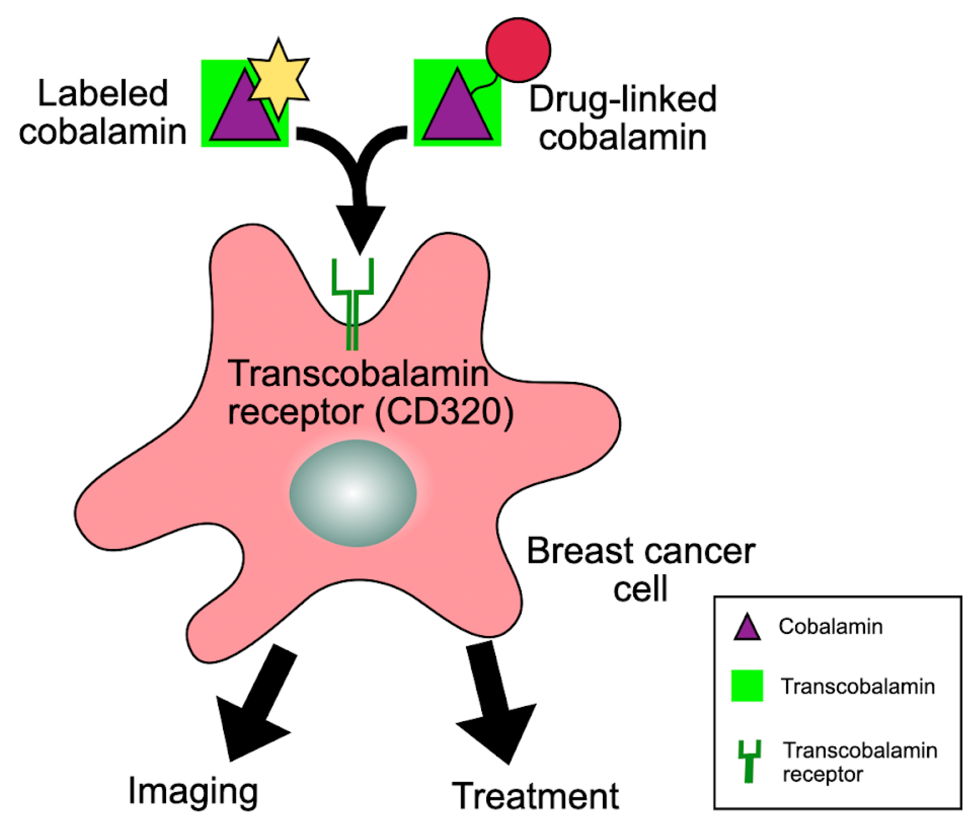 Recently, an increased interest in in vivo imaging of primary and metastatic tumors using radioisotope-labeled Cbl is under development. Thus, 89zirconium-labeled Cbl was demonstrated to be uptaken by the CD320-expressing breast cancer cell line MDA-MB-453 [82], indicating that Cbl derivatives may be used as suitable tracers for tumor visualization. In another study, 111indium labeled Cbl (111I-Cbl) was detected in breast tumors of invasive ductal carcinomas, high-grade ductal carcinoma in situ, invasive lobular carcinoma, and inflammatory breast cancer in women with breast cancer intravenously injected with 111I-Cbl prior to biopsy or breast surgery [83]. Interestingly, the signal intensity was significantly higher in triple-negative and HER2-positive tumors compared to ER+/PR+ tumors. This latter finding was confirmed using the triple-negative breast cancer line MDA-MB-231 in murine xenograft tumor models [83]. The clinical and pre-clinical evidence indicates that radioactive-labeled Cbl is a plausible method to detect breast cancer cells in vivo and also supports the idea of using CD320 to target these cells.