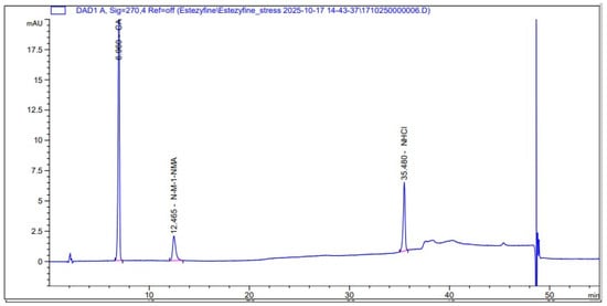 In contrast, the Chinese Pharmacopoeia [4] proposes a more favorable reversed-phase HPLC method for the assay of naftifine hydrochloride. However, it does not specify the type or dimensions of the chromatographic column, which necessitates additional method verification and optimization prior to implementation. For the determination of related substances, the Chinese Pharmacopoeia recommends using the same procedure as for the assay. Nevertheless, this approach is insufficient for the comprehensive identification of all degradation products of naftifine hydrochloride. As a result, the method requires substantial refinement to ensure accurate impurity profiling and suitability for stability testing.