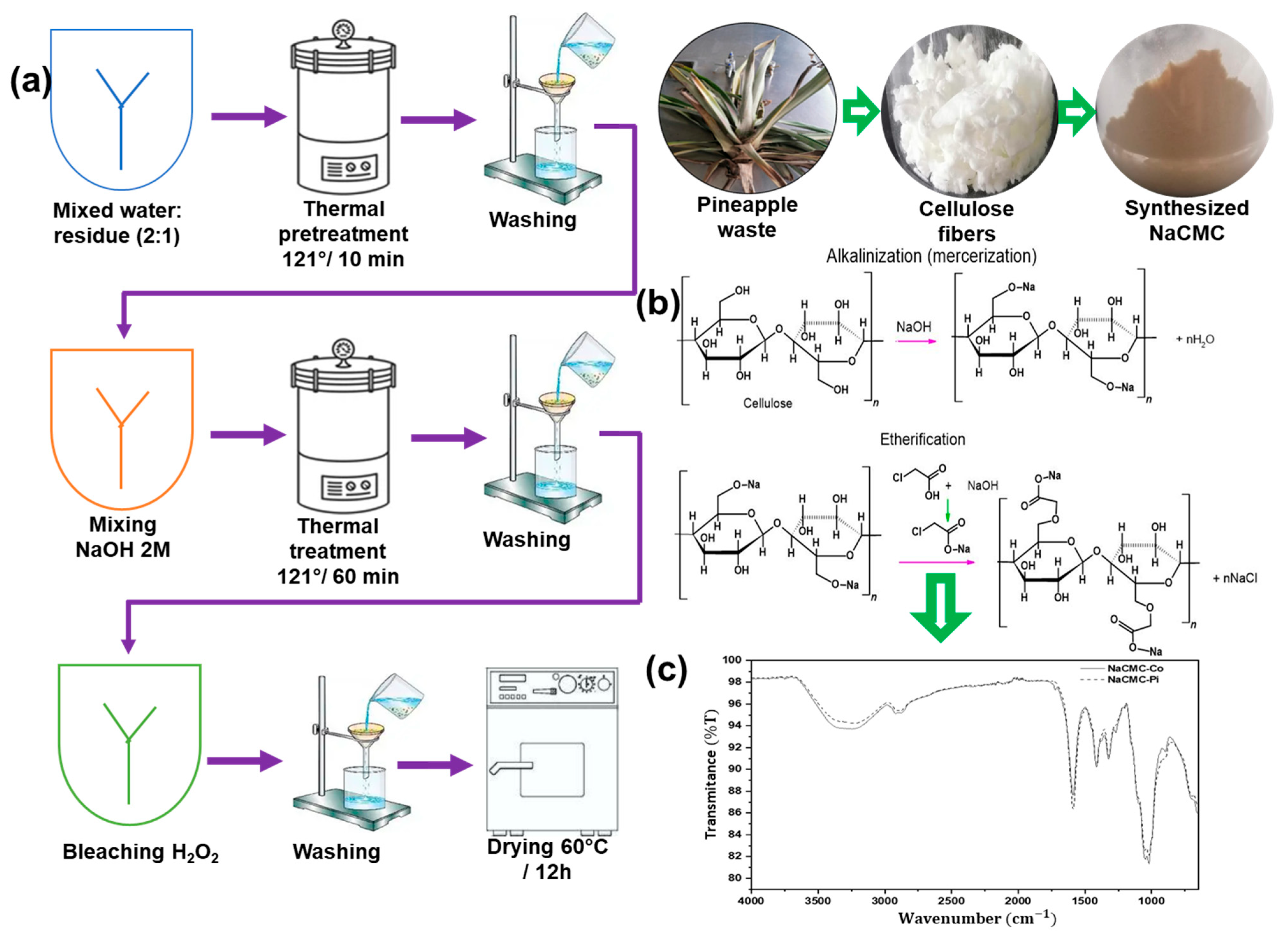 - Fouad, H.; Jawaid, M.; Karim, Z.; Meraj, A.; Abu-Jdayil, B.; Nasef, M.M.; Sarmin, S.N. Preparation and Characterization of Carboxymethyl Microcrystalline Cellulose from Pineapple Leaf Fibre. Sci. Rep. 2024, 14, 23286. [Google Scholar] [CrossRef]